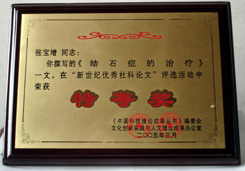 2005年3月,张宝增医师撰写的《结石症的治疗》一文,在“新世纪优秀社科论文”评选活动中荣获特等奖。